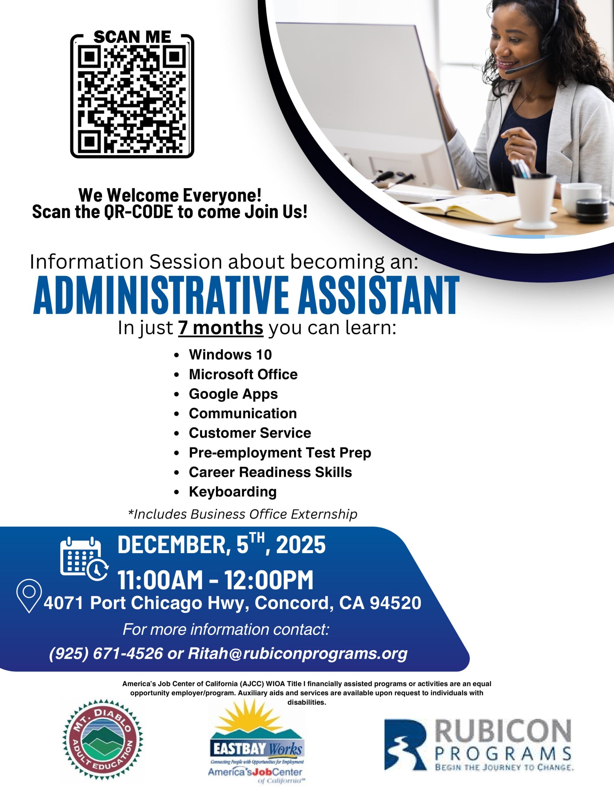 ADMINISTRATIVE ASSISTANT TRAINING INFORMATION SESSION + Add to Google Calendar + iCal / Outlook export 00 days 00 hours 00 minutes 00 seconds Date Dec 05 2025 Time 11:00 am - 12:00 pm More Info REGISTER HERE Location Concord AJCC - Rubicon Virtual/Remote Services Available Category Informational Special Training Organizer AJCC CONCORD Phone 925-671-4500 REGISTER HERE Share this event