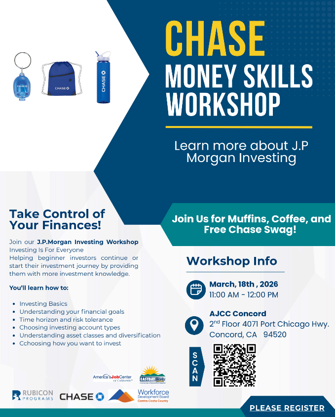 Chase Money Skills: J.P. Morgan Investing Workshop + Add to Google Calendar + iCal / Outlook export 00 days 00 hours 00 minutes 00 seconds Date Mar 18 2026 Time 11:00 am - 12:00 pm More Info Register Here! Organizer Rita Hidalgo Email ritah@rubiconprograms.org Register Here! Share this event